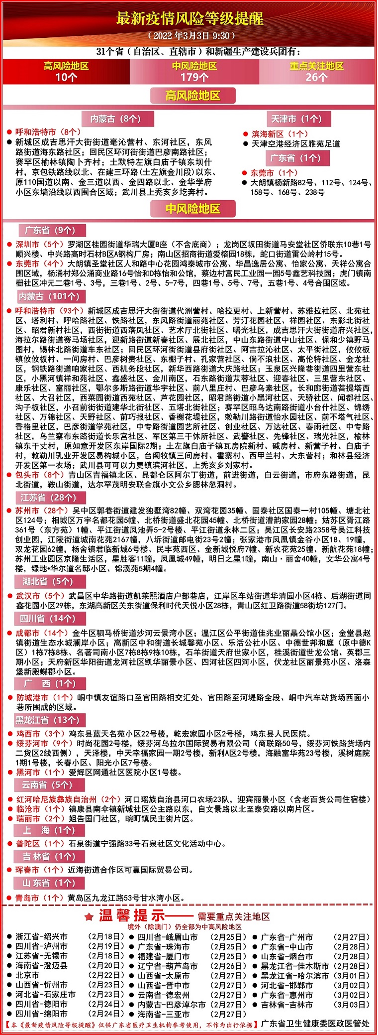 2、截至2022年3月5日前14天有中风险地区及高风险地区(参考下图,查询网址http://wsjkw.gd.gov.cn/xxgzbdfk/)所在地级市(盟、州、直辖市的区)旅居史的考生,例如有广东省深圳、东莞旅居史的;